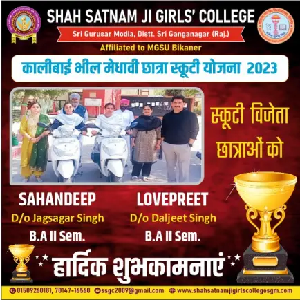 Read MoreKalaibai Bheel Medhavi Chhatra Scooty Yojana 2023 We are thrilled to announce that Ms. Sahandeep and Ms. Lovepreet, students of B.A. II Semester at Shah Satnam Ji Girls’ College, have been honored under the Kalaibai Bheel Medhavi Chhatra Scooty Yojana 2023. This prestigious recognition, initiated by the Government of Rajasthan, supports meritorious girls with a […]
